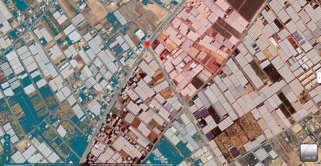 صورة عبر الأقمار الصناعية من خرائط جوجل لموقع التأثير، تظهر المساحات الخضراء بالإضافة لوجود الصوبات المخصصة للزراعة. فبراير/شباط 2024.