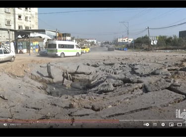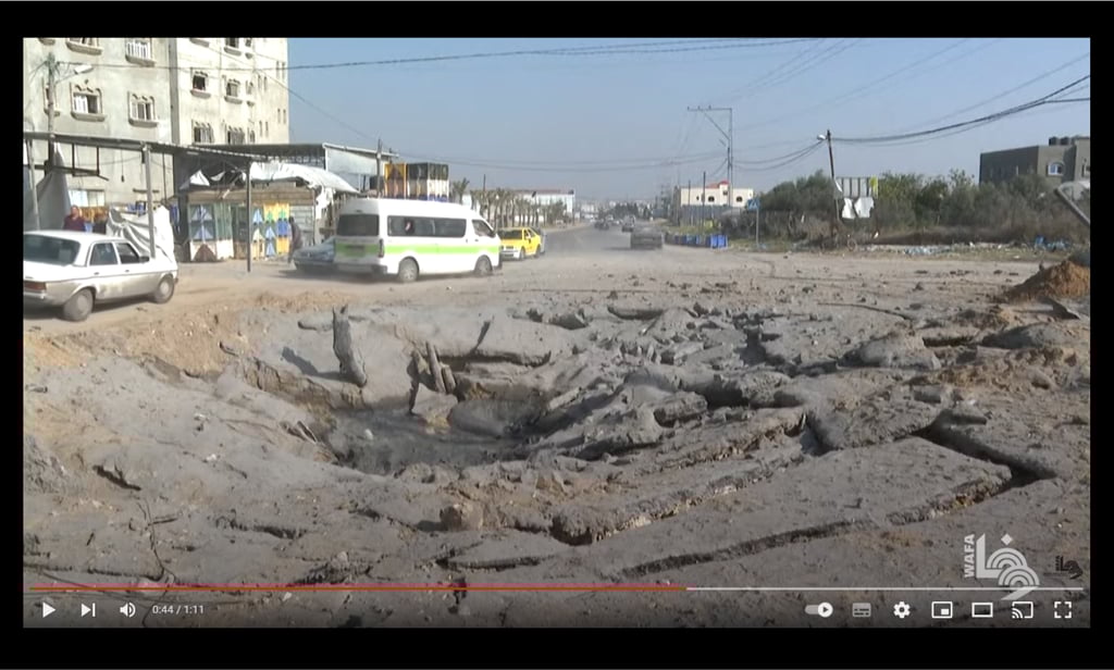 من بين هذه الحفر التي نتجت عن القصف الذي خلف دمارًا واسعًا في البنى التحتية كالطريق العام الفاصل بين خان يونس ورفح إضافة لشبكات الخدمات الأساسية أسفل الطريق المتأثر، حفرة واسعة في منتصف الطريق كادت أن تمنع العبور بشكل كامل.