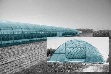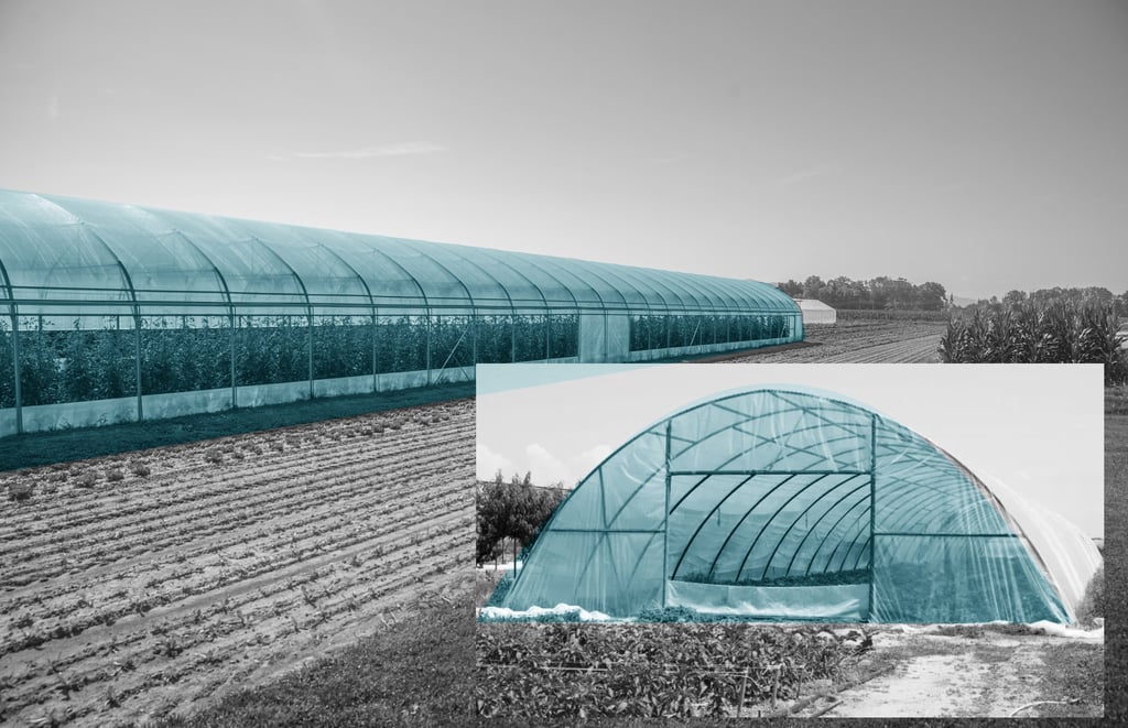 صورتين لنموذج الصوبات المخصصة للزراعة تظهر مقوسة بأغلفة بيضاء، تتشابه مع الأشكال الظاهرة على صور الأقمار الصناعية. الصورة أسفل من موقع "farm credit"، الصورة الأخرى في الخلف من موقع "freepik".