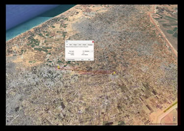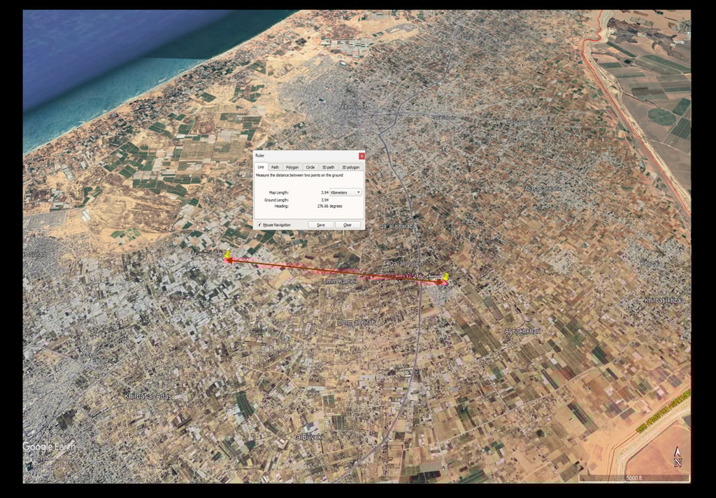 صورة من موقع جوجل إيرث للأقمار الصناعية توضح بُعد بلدة الفخاري (5 كم)، بيت نصر (2.8 كم)، و بيت الشوكة (6 كم) عن نقطة الهجوم على الطريق الفاصل بين خان يونس ورفح.