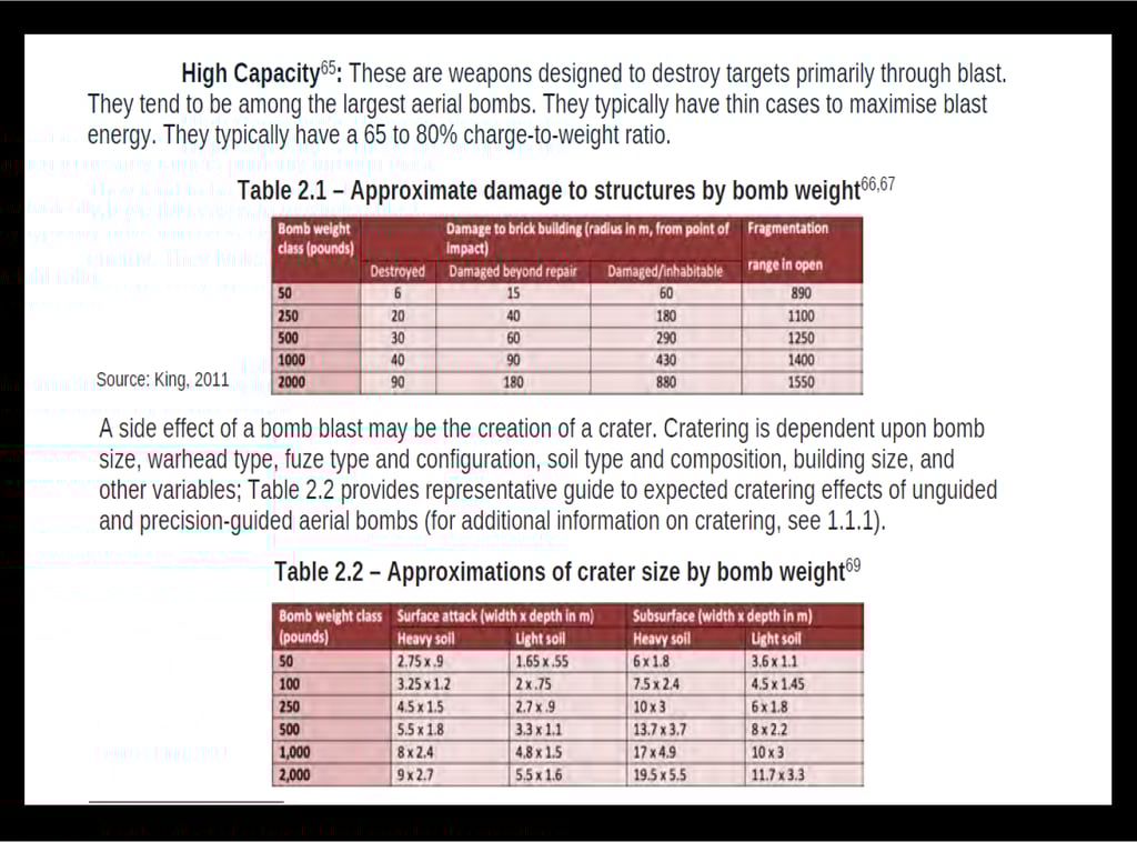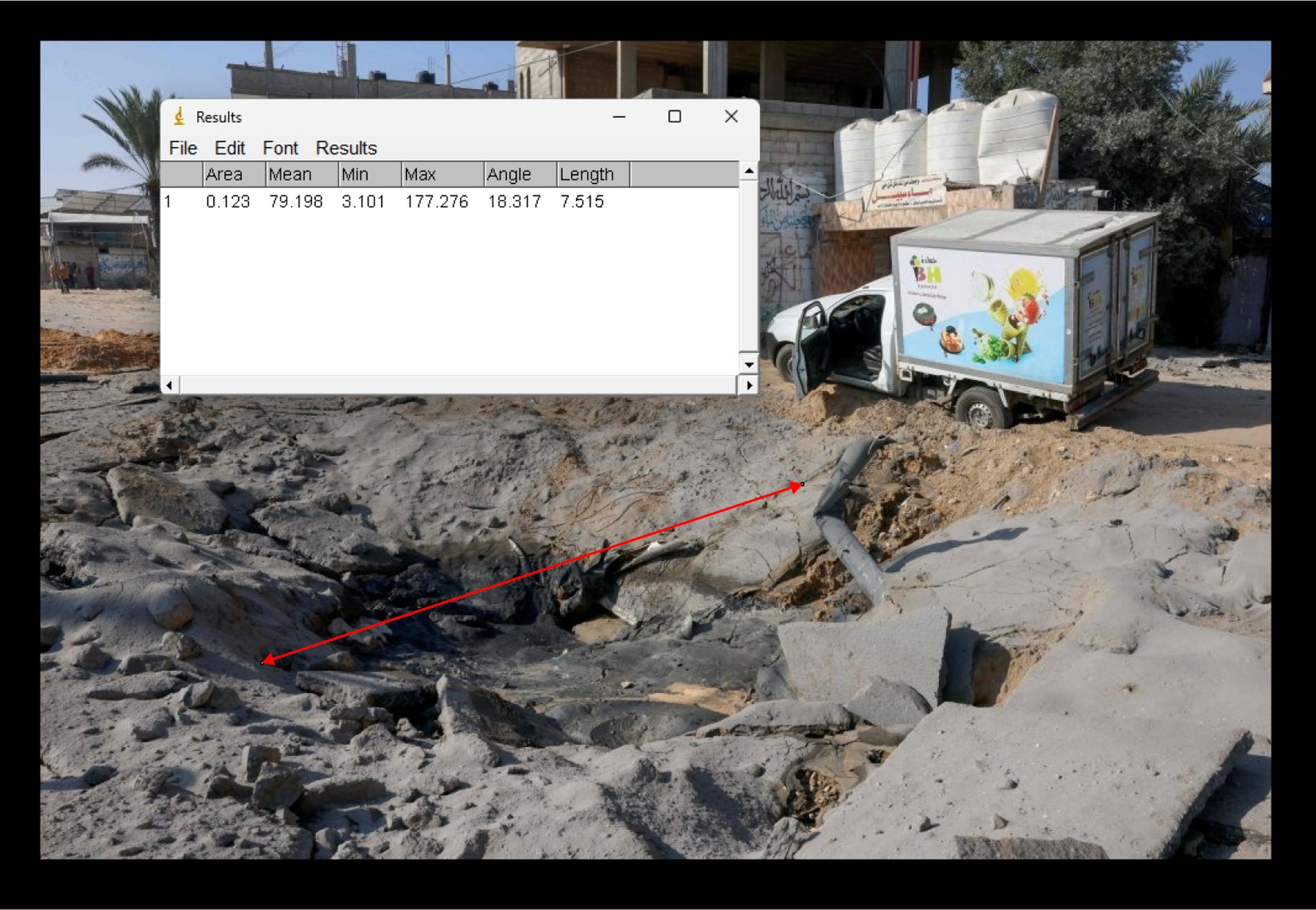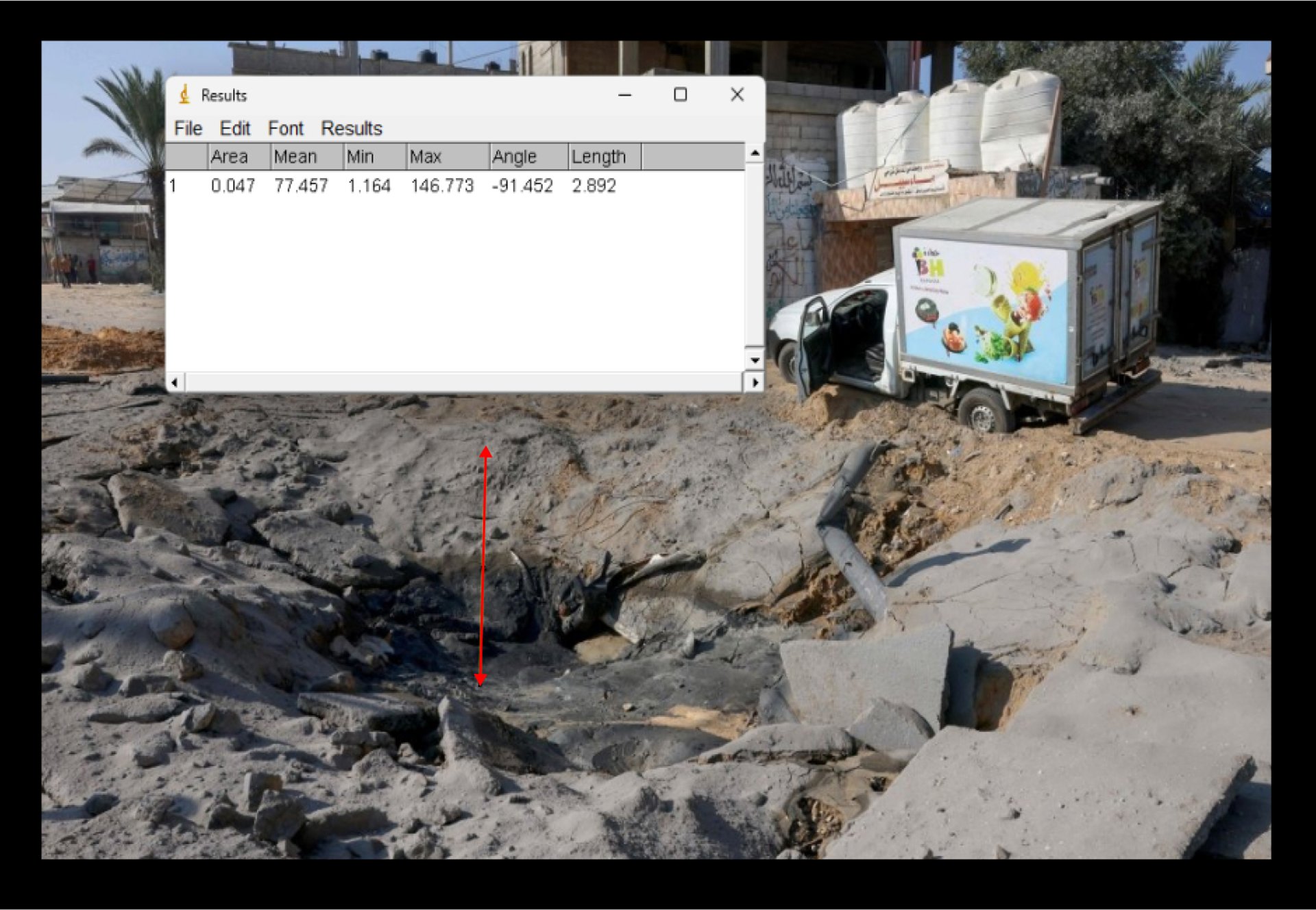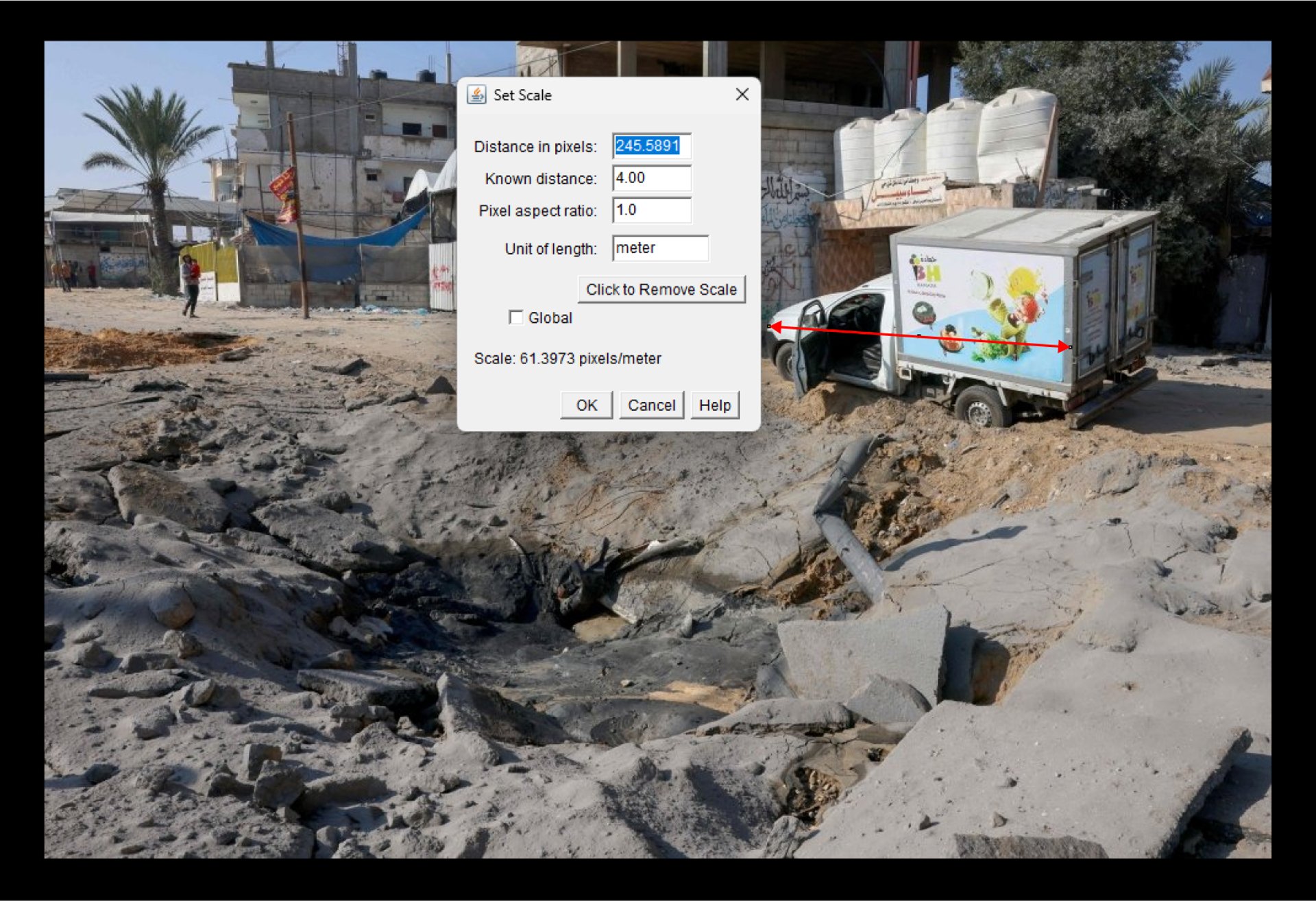 لقياس أبعاد الحفرة الناتجة عن الضربات الجوية المزعومة، تم استخدام برنامج "ImageJ" الذي يقدّر قياس الأحجام داخل الصور من خلال تحديد مرجع يعرف قياسه في الواقع، في هذه الحالة تم استخدام السيارة الموجودة كمرجع وحدة قياس في الصورة وهو 4 أمتار تقريبًا.