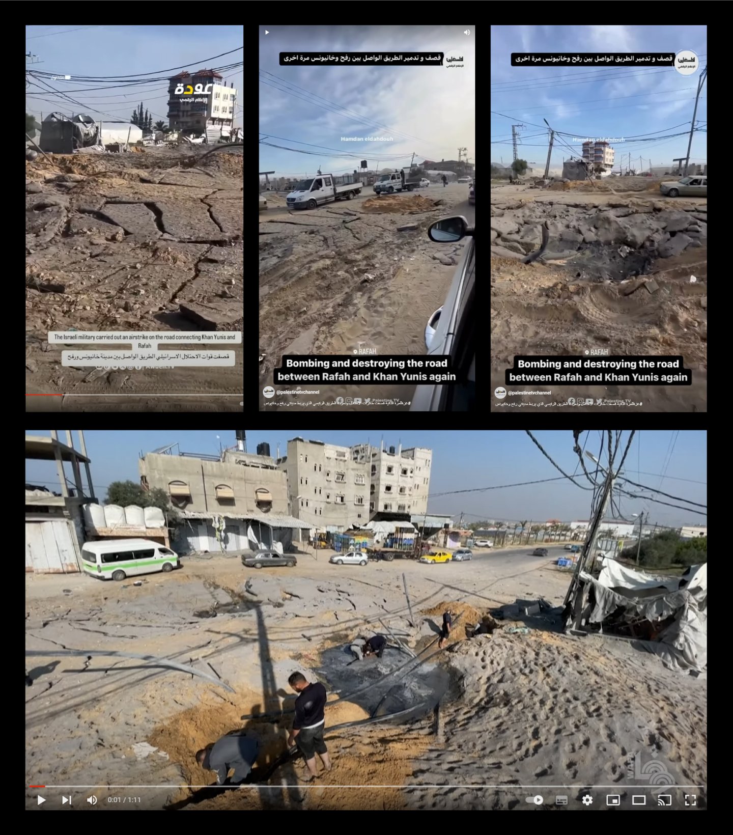 الجدير بالذكر أنه بينما يتوافق موعد بث شريط الفيديو مع تسلسل الأحداث إلا أن التحقق من أصالته وموقعه الجغرافي الدقيق كان تحديًا لفريق التحقيق نظرًا للبيانات المحدودة المتاحة، بالتالي تعذّر علينا التحقق من صحته إن كان بالفعل يظهر الدخان الناتج عن قصف الطريق الواصل بين خان يونس ورفح.