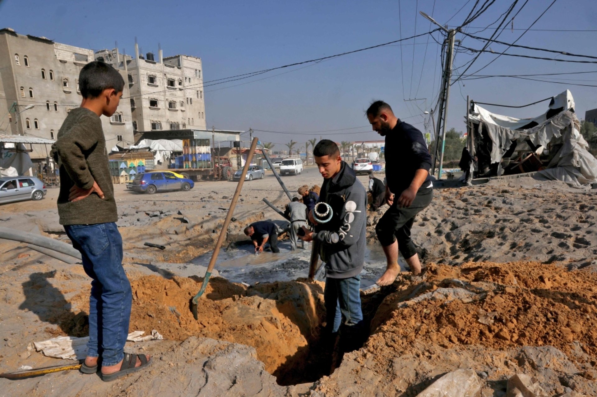 مجموعة صور تظهر تضرر شبكة المياه أسفل طريق خان يونس- رفح وبعض الأفراد وهم يعملون على إصلاح شبكات المياه. أعلى وأسفل اليمين صورة من" The Peninsula Qatar" بالإضافة للصورة أسفل اليسار. أعلى اليسار صورة من "Ahed Al-ledawi" . فبراير/شباط 2024.