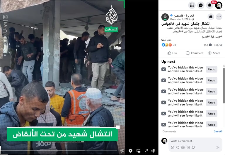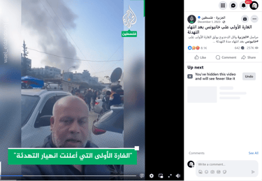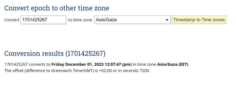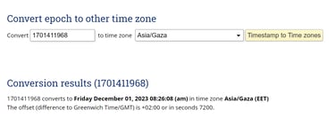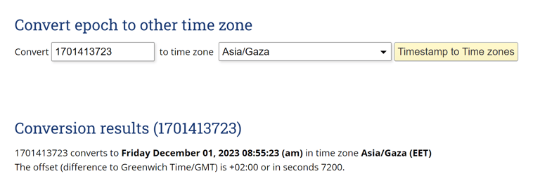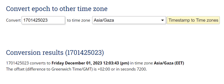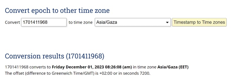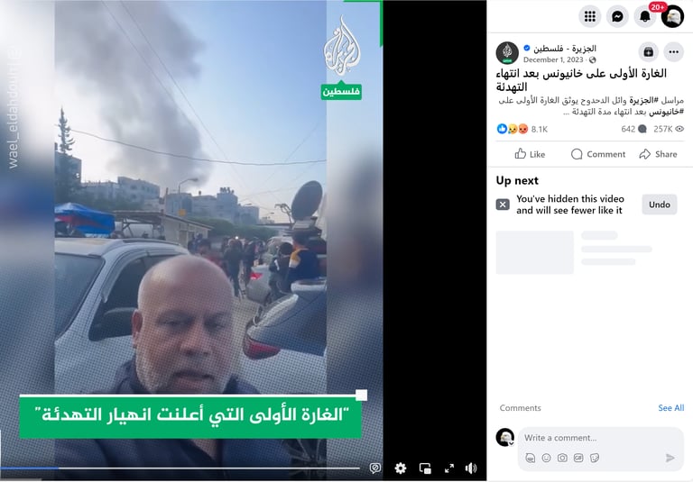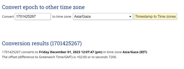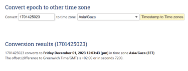 ومنه يظهر المعرف الزمني لمنشور قناة الجزيرة الأول الذي أبلغ عن أول غارة جوية على خان يونس عقب الهدنة الإنسانية على منصة فيس بوك كالتالي (1701411968) ويظهر أيضًا المعرف الزمني لمنشور الجزيرة الذي تلاه مبلغًا عن أول مجموعة ضحايا في خان يونس كالتالي (1701413723). باستخدام أداة EpochConverter لتحويل المعرف إلى توقيت مدينة غزة يظهر أن المنشور الأول نُشر يوم الجمعة الأول من ديسمبر الساعة 08:26:08 بتوقيت مدينة غزة، والمنشور الثاني بعده بنحو نصف الساعة تحديدًا عند الساعة 08:55:23 بتوقيت مدينة غزة.