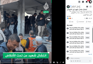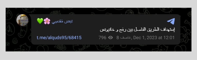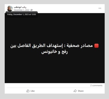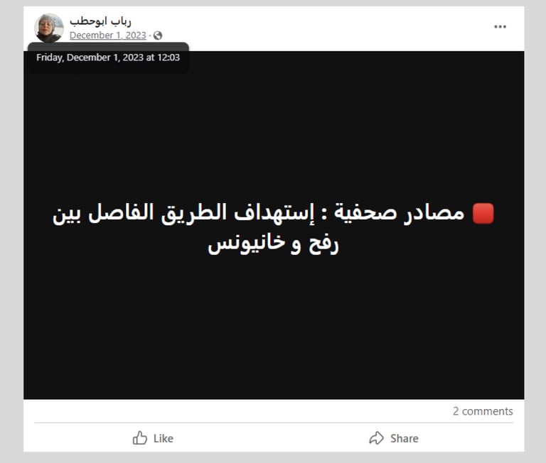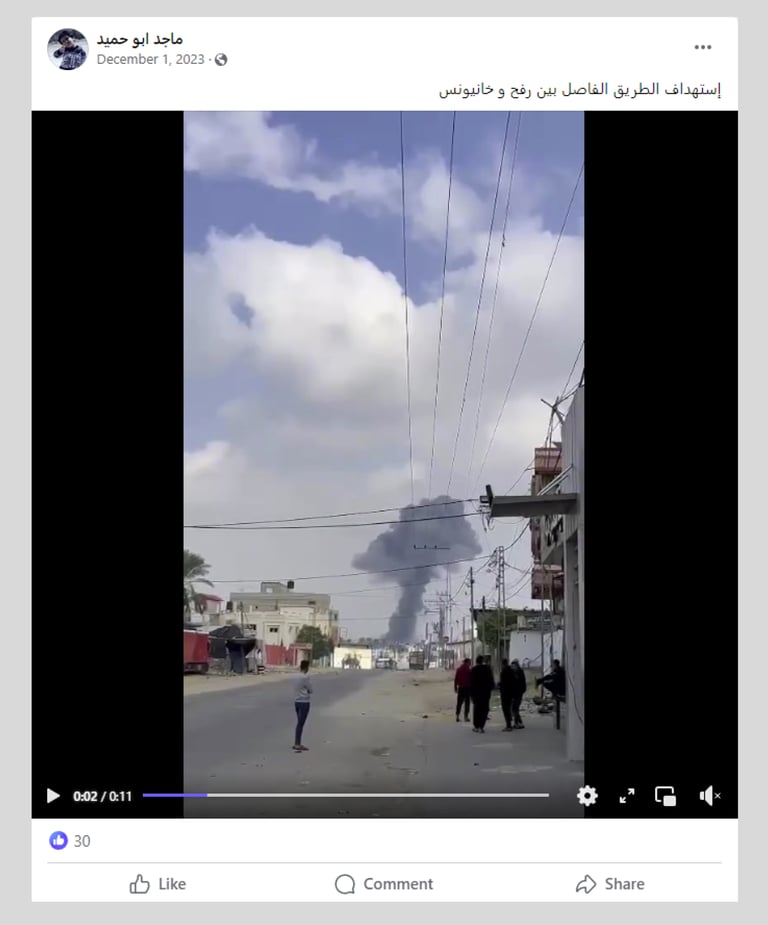 تلاه منشور آخر شاركه "ماجد ابو حميد" على فيسبوك كان يحتوي على مقطع فيديو يدّعي أنه للحظات الأولى بعد الهجوم على الطريق الفاصل بين خان يونس ورفح. تم فحص الطابع الزمني لهذا المنشور للتحقق من الوقت الدقيق لنشره والذي يظهر من خلال فحص البيانات الوصفية لتوقيت نشره على منصة فيسبوك من خلال خاصية Inspect كالتالي (1701425267) باستخدام أداة EpochConverter مجددًا لتحويل المعرف إلى توقيت مدينة غزة يظهر أنه نُشر يوم الجمعة الأول من ديسمبر/كانون الأول الساعة 12:07:47 بتوقيت مدينة غزة.