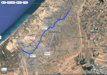 لقطة شاشة من خرائط غوغل تظهر موقع الهجوم على الطريق الواصل بين خان يونس ورفح الذي عرقل استخدام طريقين من ثلاثة قد يستخدمها المدنيين أثناء التوجه من خان يونس إلى رفح. الأزرق الداكن طريق عمر بن الخطاب الرئيسي، الأزرق الفاتح على اليمين طريق الناصر، الأزرق الفاتح على اليسار طريق الإمام علي. فبراير/شباط 2024.