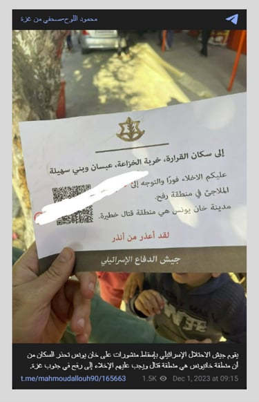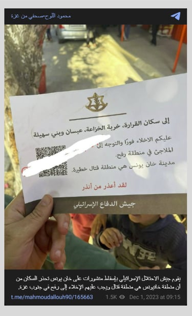 من خلال البحث العكسي عن المعلومات وجدنا أول نسخة من تلك المنشورات التي ألقاها الجيش الإسرائيلي على خان يونس طالبةً من سكان القرارة وخربة الخزاعة و عبسان وبني سهيلة التوجه إلى منطقة رفح، والتي قام بنشرها الصحفي محمود اللوح على منصة تلغرام عند الساعة 09:15 صباحًا من ذات اليوم؛ أي بعد نحو ما يقارب 49 دقيقة من بدء المعارك العسكرية في المنطقة منذ بدء استئناف العمليات العسكرية عقب اتفاق التهدئة.