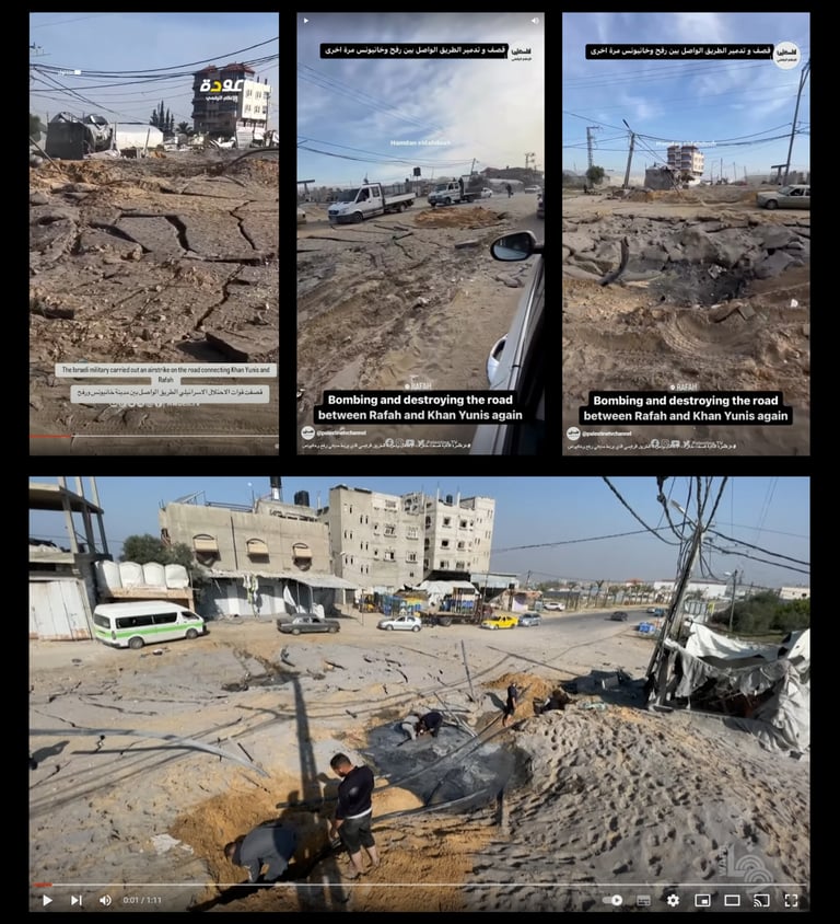 تشير الصور المتاحة وشهادات العيان الى تأثير الدمار الواسع للطريق الرئيسي الذي يربط بين خان يونس ورفح، حيث الأسفلت متصدع ومتناثر بفعل قوة الهجمات التي نتجت عنها أيضًا حفر عميقة أكبرها في منتصف الطريق، حيث أنها تعيق أي محاولة للعبور الآمن، ما يعكس تأثيرًا مباشرًا على حركة المدنيين اليومية. تظهر هذه التبعات على حركة المدنيين جليًا في إحدى الصور التي شاركها مصدر أخباري على منصة تويتر ينذر فيها بمدى تأثر الوضع من خلال المركبة العالقة على طرف الحفرة التي خلفها قصف الطريق. تقطع هذه الأضرار سبل الوصول، وتُجبر الأهالي على تغيير مساراتهم المعتادة، ما يضيف عبئًا كبيرًا على حياتهم اليومية ومدى شعورهم بالأمان أثناء التوجه إلى مناطق آمنة مزعومة.