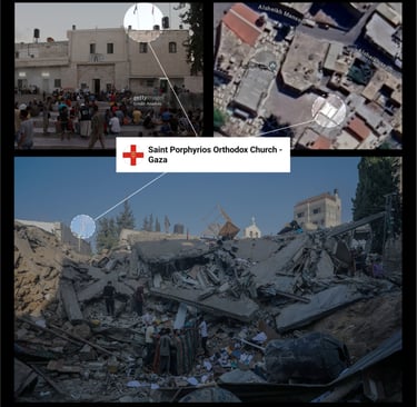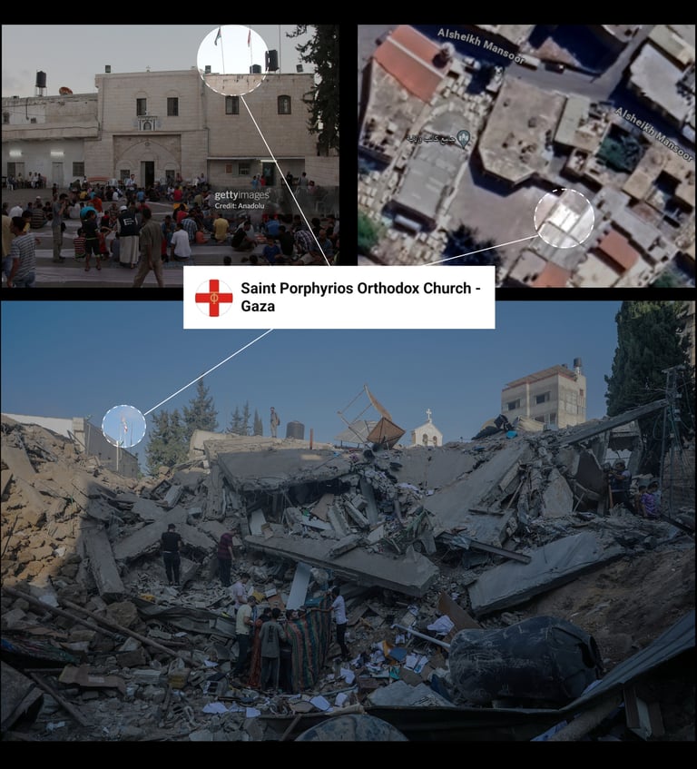 The aerial views of the church's location show the exact building that appeared in media reports of the October 19 attack. Gaza’s Old City includes several significant historical sites, such as the Saint Porphyrius church and the Kateb Wilaya Mosque.