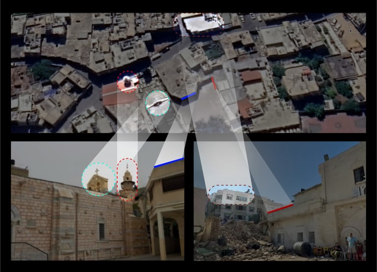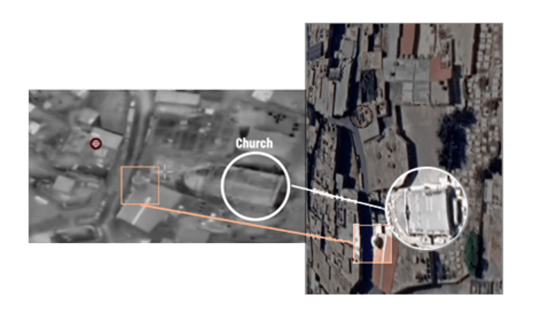The pillared building, depicted below, appeared in several videos showing the destruction of the compound by the airstrike. By using the image below we were able to confirm that the same building that was impacted by the strike, and is leaning towards the Church's eastern wall, is the one that we located by satellite.