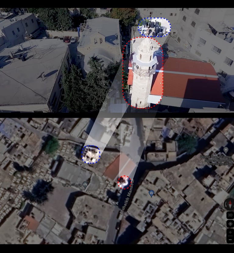 A video report provided a street view of Alsheikh Mansoor Street after the airstrike, showing people in the street outside the attacked building. The video shows a tinplate-covered top of a building, showing similarities and matches between both the deleted Israeli military satellite video and the Reuters report. The trees in the yard of the building survived and are still next to the red-marked corner at the top of the building.