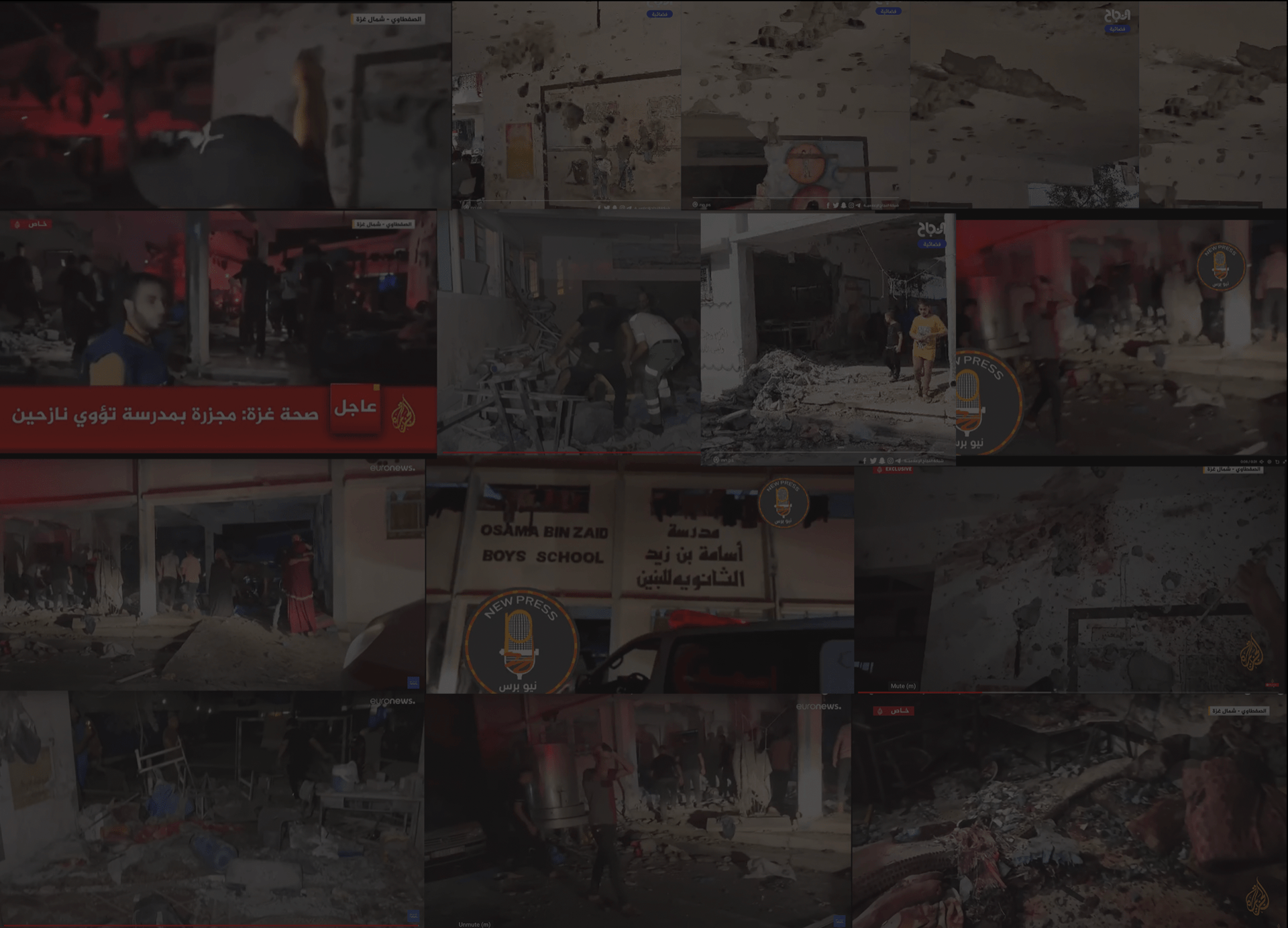 By following the timeline of reports about the bombing of Usama bin Zaid School, the estimated time for the attack can be placed between 7:27 p.m. and 8:22 p.m. in Gaza local time.
