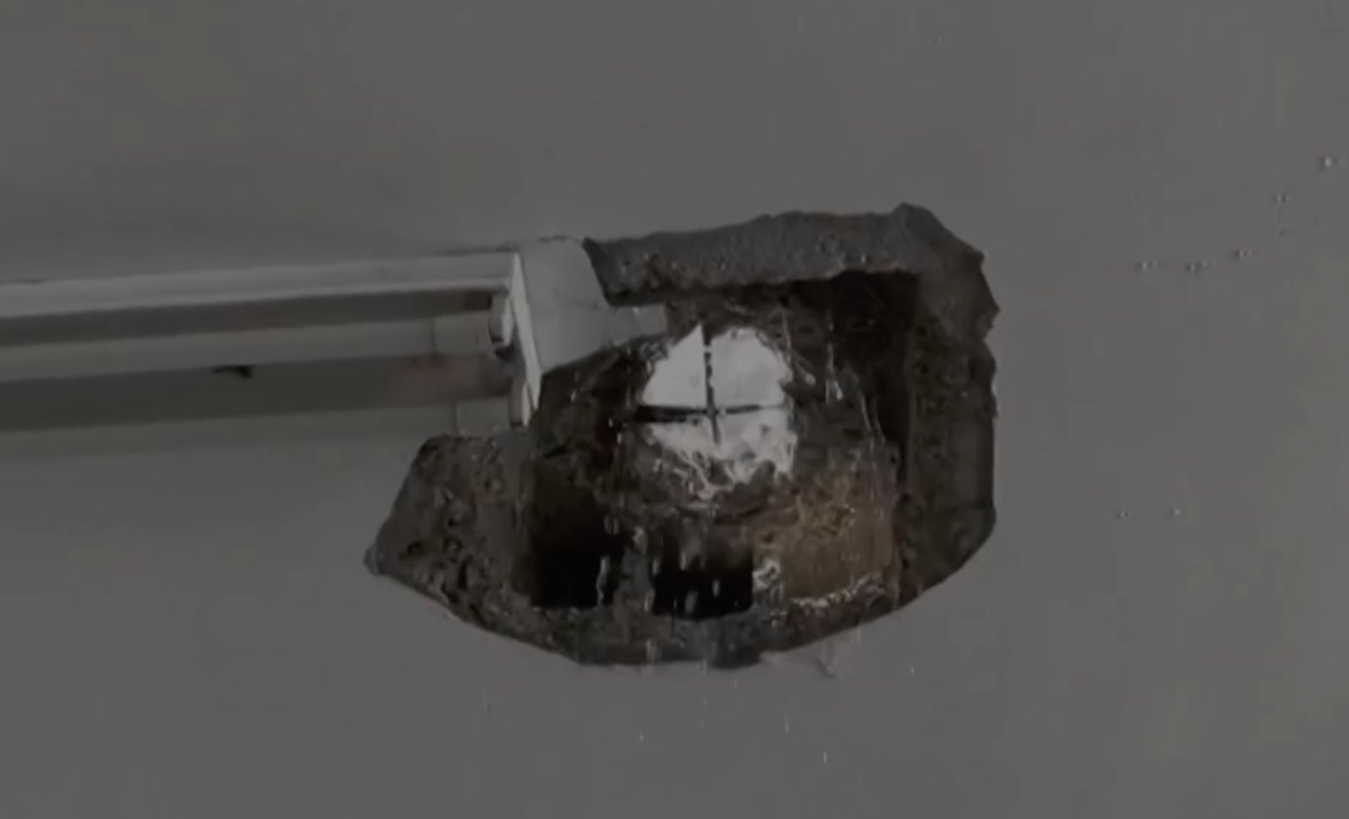 Visual evidence reveals damage to the attic of the school building, along with ruptured water pipes, which might explain the water leakage through the hole in the ceiling of one of the damaged classrooms.