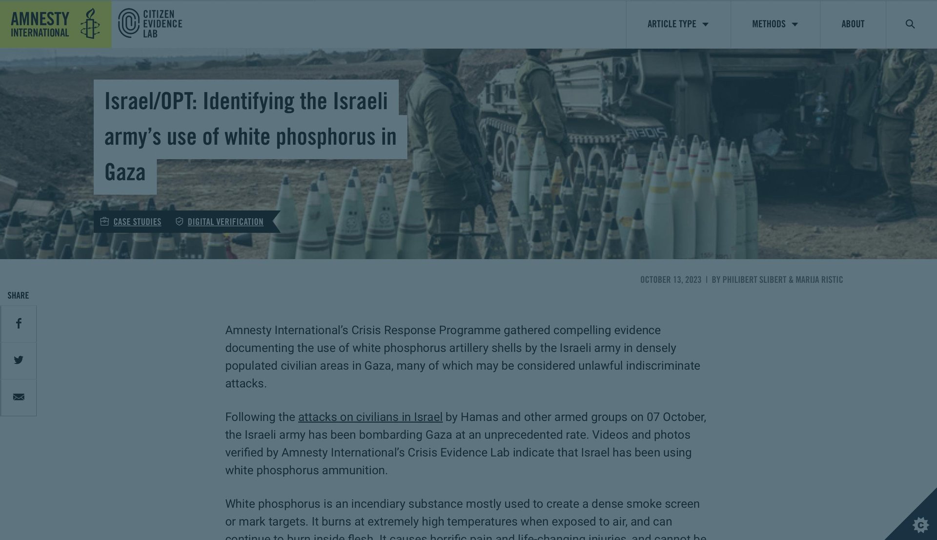 In October, Amnesty International documented the Israeli army's use of white phosphorus artillery shells in densely populated civilian areas in Gaza, deeming some of these attacks indiscriminate between civilians and military targets, thereby making them unlawful.