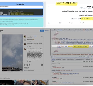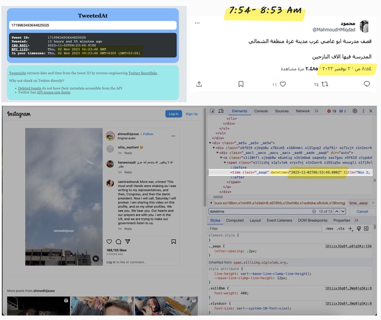 The smoke from the shelling made it challenging to determine the precise time of the attack through shadow analysis. However, based on the available data, it was estimated that the attack likely occurred between 7:54 a.m.—the time of the first news report—and 8:53 a.m., which is when a video documenting the attack was uploaded, as per Gaza local time.