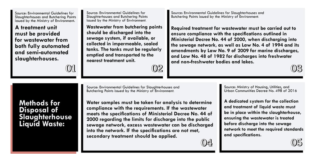 Most of the slaughterhouses mentioned in this investigation discharge their wastewater directly into the sewage networks without any treatment. This wastewater is governed by the standards outlined in Decision No. 44 of 2000, which sets the maximum allowable pollutant levels for discharge into the sewage network.