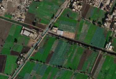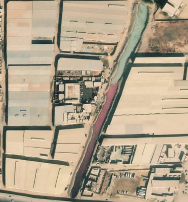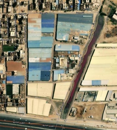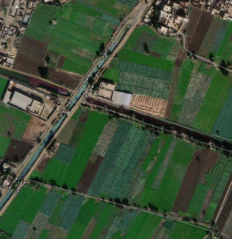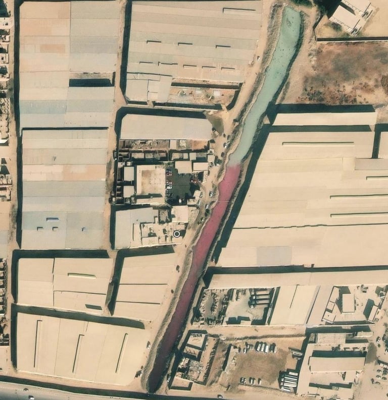 The environmental crisis associated with slaughterhouses extends beyond internal violations to the improper discharge of contaminated wastewater into agricultural irrigation canals and sewer networks. Satellite imagery reveals the scope of this disaster, particularly at waterways adjacent to facilities such as the "Oulad Bakri" slaughterhouse in Kom Ashfin, Qalyubia Governorate. Images from November 2, 2022, show blood contaminating the canal's water, spreading far beyond the facility's discharge point.