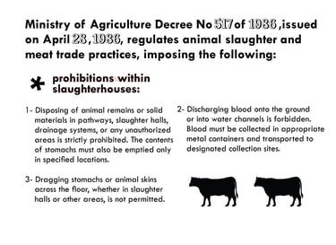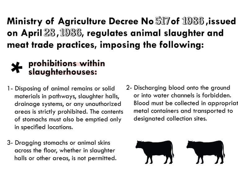 Both government-run and private slaughterhouses and butchering points in Egypt are governed by Ministerial Decree No. 498 of 2016, issued by the Ministry of Housing, Utilities, and Urban Communities. This regulation, published in the Official Gazette on August 24, 2016, is overseen by the General Directorate of Slaughterhouses, operating under the General Authority for Veterinary Services within the Ministry of Agriculture.