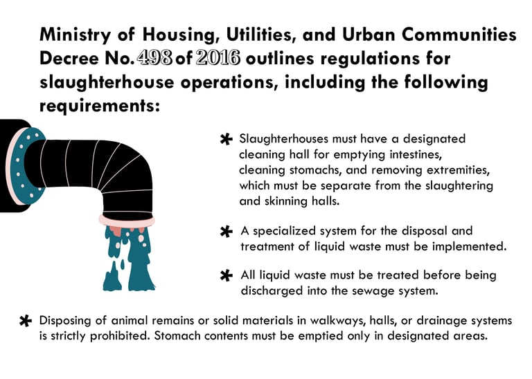 This investigative report examines the environmental threats stemming from improper disposal of slaughterhouse waste into Egypt’s sewage networks and freshwater canals. It also exposes environmental and legal violations in government-run slaughterhouses, which contravene Ministerial Decree No. 498 of 2016 on slaughterhouse requirements and the Environmental Guidelines for Slaughterhouses and Butchering Points issued by the Ministry of Environment.