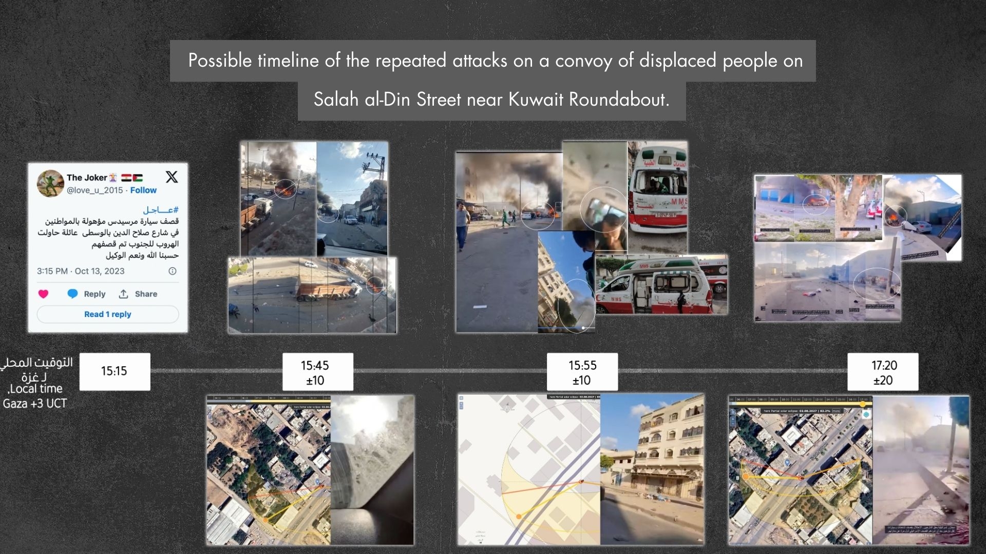 We cannot confirm the time estimates that we arrived at through shadow analysis, as the images of the shadows were taken from imprecise locations and analysis the provided different results. However, we can conclude that the likely time of the multiple attacks on the convoy of displaced people on Salah al-Din Street near Kuwait Roundabout was between 15:15 and 17:20 Gaza City time. One of these attacks included three strikes only seconds apart.
