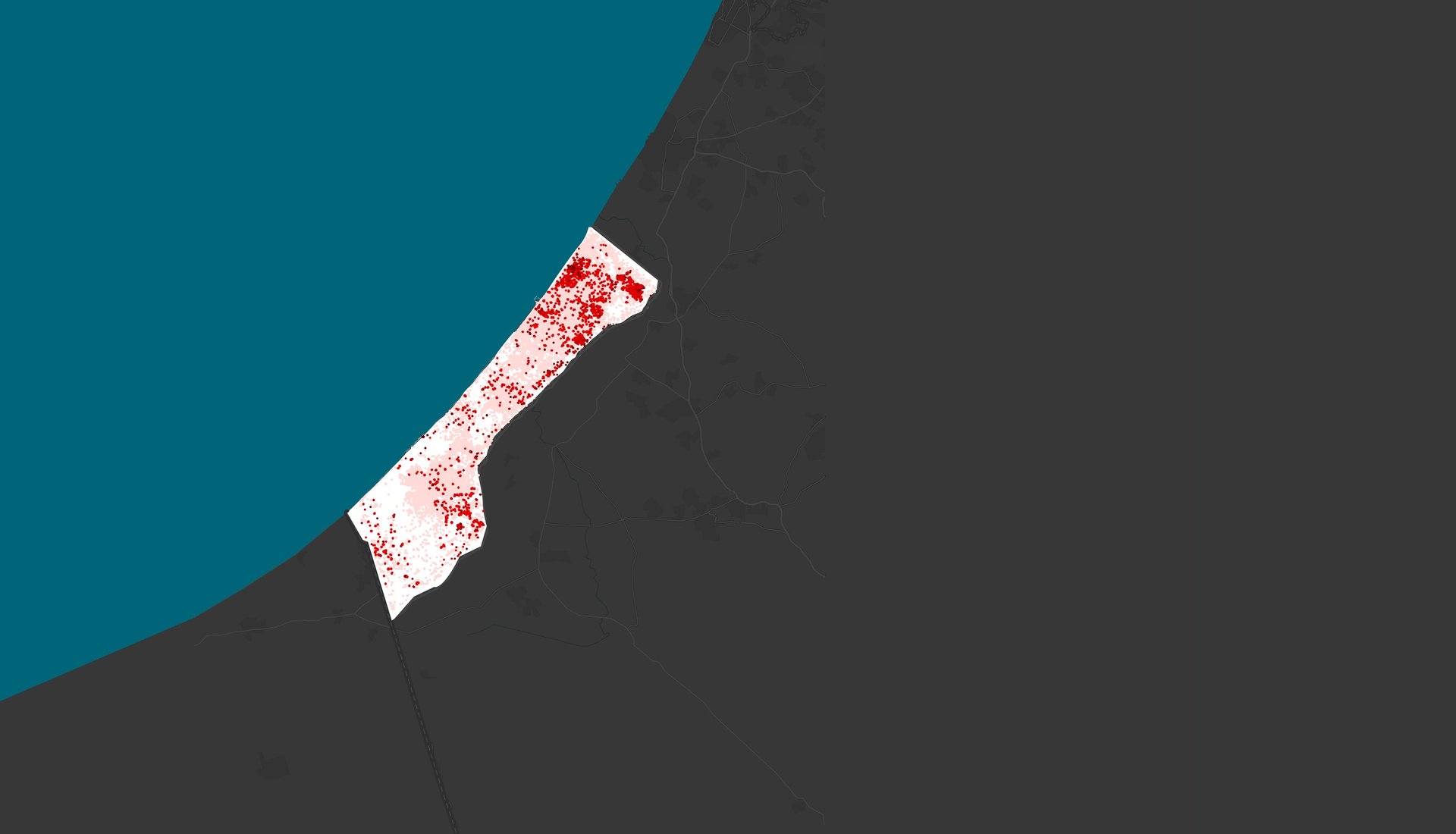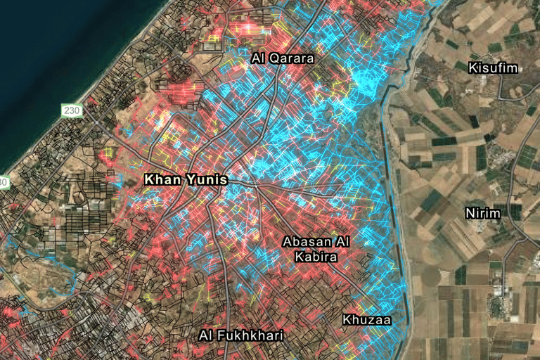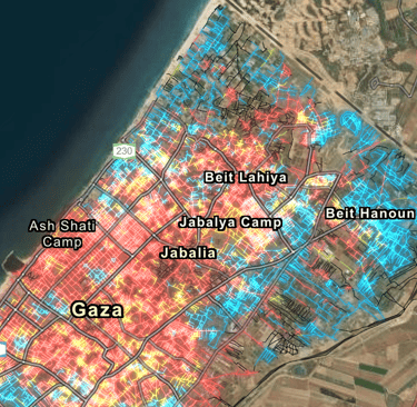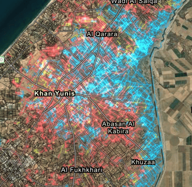 وفقًا لبيانات الخرائط، تعد منطقة شمال قطاع غزة وخان يونس الأكثر تأثرًا نتيجة للأعمال العسكرية في المنطقة منذ أكتوبر 2023 حيث تدخل في نطاق اللون الأصفر (الأعلى ضررًا) على خريطة الأضرار، الأمر الذي تعكسه الصور الحديثة للأقمار الصناعية.